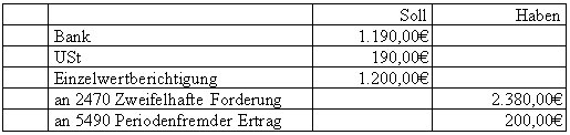 Im Vorjahr hatten Sie auf eine Bruttoforderung von 2.380€ 60% Wertberichtigungen vorgenommen. Bei Vergleichende werden Ihnen 50% = 1.190€ überwiesen. Wie lauten die Buchungen im neuen Jahr?
