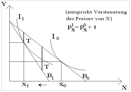 Der Preis von Gut X erhöht sich um den Steuerbetrag t, also pX1 = pX0 + t.